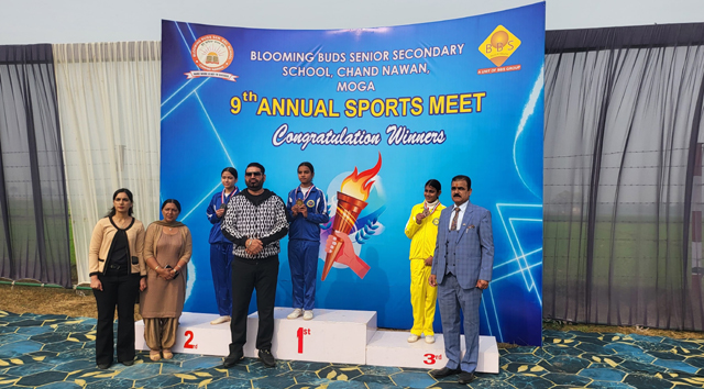 ਜ਼ਿਲ੍ਹਾ ਮੋਗਾ ਦੀਆਂ ਮਾਣਮੱਤੀ, ਨਾਮਵਰ ਅਤੇ ਅਗਾਂਹਵਧੂ ਵਿੱਦਿਅਕ ਸੰਸਥਾਵਾਂ ਬੀ.ਬੀ.ਐਸ ਗਰੁੱਪ ਆਫ ਸਕੂਲਜ਼ ਜੋ ਕਿ ਗਰੁੱਪ ਚੇਅਰਮੈਨ ਡਾਕਟਰ ਸ਼੍ਰੀ ਸੰਜੀਵ ਕੁਮਾਰ ਸੈਣੀ ਅਤੇ ਚੇਅਰਪਰਸਨ ਮੈਡਮ ਕਮਲ ਸੈਣੀ ਦੀ ਯੋਗ ਸਰਪ੍ਰਸਤੀ ਹੇਠ ਚੱਲ ਰਹੀਆਂ ਹਨ ਦਾ ਹਿੱਸਾ ਬਲੂਮਿੰਗ ਬੱਡਜ਼ ਸੀਨੀਅਰ ਸੈਕੰਡਰੀ ਸਕੂਲ, ਪਿੰਡ-ਚੰਦਨਵਾਂ, ਤਹਿਸੀਲ-ਬਾਘਾਪੁਰਾਣਾ ਅਤੇ ਜ਼ਿਲ੍ਹਾ-ਮੋਗਾ ਵਿਖੇ ਹੋਏ 9ਵੇਂ ਸਲਾਨਾ ਖੇਡ ਸਮਾਗਮ ਵਿੱਚ ਜੇਤੂ ਰਹੇ ਵਿਦਿਆਰਥੀਆਂ ਨੂੰ ਸਨਮਾਨਿਤ ਕੀਤਾ ਗਿਆ।ਇਸ ਵਿਸ਼ੇਸ਼ ਸਮਾਰੋਹ ਦਾ ਉਦਘਾਟਨ ਕਰਨ ਲਈ ਮੁੱਖ ਮਹਿਮਾਨ ਵੱਜੋਂ ਮਸ਼ਹੂਰ ਪੰਜਾਬੀ ਗਾਇਕ ਕੇ.ਐਸ ਮੱਖਣ ਨੇ ਸ਼ਿਰਕਤ ਕੀਤੀ ਅਤੇ ਸਕੂਲ ਦੇ ਵਿਦਿਆਰਥੀਆਂ ਦੀ ਹੌਂਸਲਾ ਅਫਜ਼ਾਈ ਕੀਤੀ ।ਇਸ ਖੇਡ ਸਮਾਗਮ ਵਿੱਚ ਕੁੱਲ 20 ਖੇਡਾਂ ਅਤੇ 19 ਟ੍ਰੈਕ ਅਤੇ ਫੀਲਡ ਈਵੈਂਟ ਹੋਏ, ਜਿਹਨਾਂ ਵਿੱਚ ਵਧੀਆ ਪ੍ਰਦਰਸ਼ਨ ਕਰਨ ਵੱਲੇ ਵਿਦਿਆਰਥੀਆਂ ਨੂੰ ਸਕੂਲ ਮੈਨੇਜਮੈਂਟ ਅਤੇ ਆਏ ਹੋਏ ਮੁੱਖ ਮਹਿਮਾਨਾਂ ਵੱਲੋਂ ਸਨਮਾਨਿਤ ਕੀਤਾ ਗਿਆ । ਇਸ ਮੌਕੇ ਗਲਬਾਤ ਕਰਦੇ ਹੋਏ ਸਕੂਲ ਮੁੱਖ ਅਧਿਆਪਕਾ ਮੈਡਮ ਸਰਬਜੀਤ ਸ਼ਰਮਾ ਵੱਲੋਂ ਦੱਸਿਆ ਗਿਆ ਕਿ ਪ੍ਰੀ ਨਰਸਰੀ ਦੇ ਵਿਦਿਆਰਥੀਆਂ ਦੀਆਂ ਹੋਈਆਂ ਰੇਸਾਂ ਵਿੱਚ ਨਵਰੂਪ ਕੌਰ ਨੇ ਪਹਿਲਾ,ਗੁਰਪ੍ਰੀਤ ਸਿੰਘ ਨੇ ਦੂਜਾ ਅਤੇ ਸ਼ੁੱਭਦੀਪ ਸਿੰਘ ਨੇ ਤੀਜਾ ਸਥਾਨ ਹਾਸਲ ਕੀਤਾ । 70 ਮੀਟਰ ਰੇਸ ਵਿੱਚ ਗੁਰਪ੍ਰਤਾਪ ਸਿੰਘ ਅਤੇ ਮਨਸੀਰਤ ਕੌਰ ਨੇ ਪਹਿਲਾ ਸਥਾਨ ਹਾਸਲ ਕੀਤਾ ।100 ਮੀਟਰ ਰੇਸ ਵਿੱਚ ਮਨਜੋਤ ਸਿੰਘ ਅਤੇ ਪ੍ਰਭਜੋਤ ਕੌਰ ਨੇ ਪਹਿਲਾ ਸਥਾਨ ਹਾਸਲ ਕੀਤਾ ।100 ਮੀਟਰ ਰੇਸ ਅੰਡਰ-9 ਆਯੂ ਗੁੱਟ ਵਿੱਚ ਸਤਕਾਰਦੀਪ ਸਿੰਘ ਅਤੇ ਸੁਖਮੀਤ ਕੌਰ ਨੇ ਪਹਿਲਾ ਸਥਾਨ ਹਾਸਲ ਕੀਤਾ ।ਅੰਡਰ-11 ਵਿੱਚ ਪਰਮਪਾਲ ਸਿੰਘ ਅਤੇ ਜਸਮੀਤ ਕੌਰ ਨੇ ਪਹਿਲਾ ਸਥਾਨ ਹਾਸਲ ਕੀਤਾ ।ਅੰਡਰ-14 ਆਯੂ ਗੁੱਟ ਵਿੱਚ ਸਹਿਜਦੀਪ ਸਿੰਘ ਅਤੇ ਅਰਮਾਨ ਕੌਰ ਨੇ ਪਹਿਲਾ ਸਥਾਨ ਹਾਸਲ ਕੀਤਾ ।ਅੰਡਰ-17 100 ਮੀਟਰ ਰੇਸ ਵਿੱਚ ਅਭਿਜੋਤ ਸਿੰਘ ਬਰਾੜ ਅਤੇ ਨਵਨੀਤ ਕੌਰ ਨੇ ਪਹਿਲਾ ਸਥਾਨ ਹਾਸਲ ਕੀਤਾ ।ਅੰਡਰ-19 ਆਯੂ ਗੁੱਟ ਵਿੱਚ ਗੁਰਨੂਰ ਸਿੰਘ ਅਤੇ ਸਰਬਜੀਤ ਕੌਰ ਨੇ ਪਹਿਲਾ ਸਥਾਨ ਹਾਸਲ ਕੀਤਾ ।ਅੰਡਰ-11 ਆਯੂ ਗੁੱਟ 200 ਮੀਟਰ ਰੇਸ ਵਿੱਚ ਹਰਜੋਤ ਸਿੰਘ ਅਤੇ ਕੁਲਵੀਰ ਕੌਰ ਨੇ ਪਹਿਲਾ ਸਥਾਨ ਹਾਸਲ ਕੀਤਾ ।ਅੰਡਰ-14 200 ਮੀਟਰ ਰੇਸ ਵਿੱਚ ਈਮਾਨਅੂਲ ਸਿੰਘ ਅਤੇ ਜਸਪ੍ਰੀਤ ਕੌਰ ਨੇ ਪਹਿਲਾ ਸਥਾਨ ਹਾਸਲ ਕੀਤਾ ।ਅੰਡਰ-17 200 ਮੀਟਰ ਰੇਸ ਵਿੱਚ ਰਮਨਦੀਪ ਸਿੰਘ ਅਤੇ ਆਂਚਲ ਕੌਰ ਨੇ ਪਹਿਲਾ ਸਥਾਨ ਹਾਸਲ ਕੀਤਾ । ਅੰਡਰ-19 200 ਮੀਟਰ ਰੇਸ ਵਿੱਚ ਸ਼ਮਨਪ੍ਰੀਤ ਸਿੰਘ ਅਤੇ ਕਰਮਪ੍ਰੀਤ ਕੌਰ ਨੇ ਪਹਿਲਾ ਸਥਾਨ ਹਾਸਲ ਕੀਤਾ ।ਅੰਡਰ-14 400 ਮੀਟਰ ਰੇਸ ਵਿੱਚ ਰਿਸ਼ਵ ਕੁਮਾਰ ਨੇ ਪਹਿਲਾ ਸਥਾਨ ਹਾਸਲ ਕੀਤਾ ।ਅੰਡਰ-19 600 ਮੀਟਰ ਰੇਸ ਵਿੱਚ ਵਿਕਾਸ ਕੁਮਾਰ ਨੇ ਪਹਿਲਾ ਸਥਾਨ ਹਾਸਲ ਕੀਤਾ ।ਇਸੇ ਤਰ੍ਹਾਂ ਫਨ ਰੇਸਿਜ਼ ਵਿੱਚ ਅੰਡਰ-5 ਵਿੱਚ ਗੁਰਫਤਿਹ ਸਿੰਘ , ਗੁਰਲੀਨ ਕੌਰ, ਸਾਬਿਜੋਤ ਸਿੰਘ,ਰਹਿਮਤਵੀਰ ਸਿੰਘ ,ਮਨਕੀਰਤ ਕੌਰ ਅਤੇ ਨਿਮਰਤ ਕੌਰ ਨੇ ਪਹਿਲਾ ਸਥਾਨ ਹਾਸਲ ਕੀਤਾ ।ਅੰਡਰ-7 ਫਨ ਰਸਿਜ਼ ਵਿੱਚ ਦਿਲਜੋਤ ਕੌਰ, ਦਿਲਰਾਜ ਸਿੰਘ,ਗੁਰਸੀਰਤ ਕੌਰ,ਜਸਕਰਨ ਸਿੰਘ,ਰਾਜਵੀਰ ਕੌਰ,ਮਨਪ੍ਰੀਤ ਕੌਰ ਨੇ ਪਹਿਲਾ ਸਥਾਨ ਹਾਸਲ ਕੀਤਾ ।ਚਾਟੀ ਰੇਸ ਵਿੱਚ ਸਿਮਰਜੀਤ ਕੌਰ ਨੇ ਪਹਿਲਾ ਸਥਾਨ ਹਾਸਲ ਕੀਤਾ ।ਅੰਡਰ-17 100 ਮੀਟਰ ਰਿਲੇ ਰੇਸ ਵਿੱਚ ਅੰਮ੍ਰਿਤਪਾਲ ਸਿੰਘ,ਗਗਨਦੀਪ ਸਿੰਘ,ਗੁਰਸ਼ਾਨ ਸਿੰਘ ਅਤੇ ਅਭਿਜੋਤ ਸਿੰਘ ਨੇ ਪਹਿਲਾ ਸਥਾਨ ਹਾਸਲ ਕੀਤਾ । ਅੰਡਰ-17 ਲੜਕੀਆਂ 100 ਮੀਟਰ ਰਿਲੇ ਰੇਸ ਵਿੱਚ ਸਿਮਰਨਜੀਤ ਕੌਰ,ਜਾ
